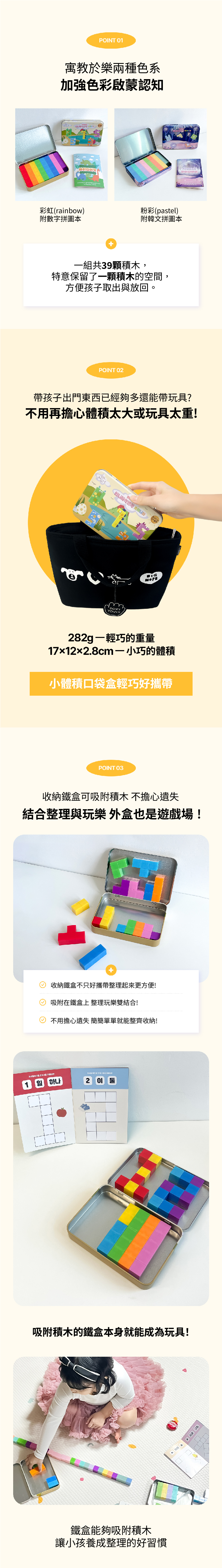 ◦ 磁吸鐵盒收納方便,外盒也是遊戲場